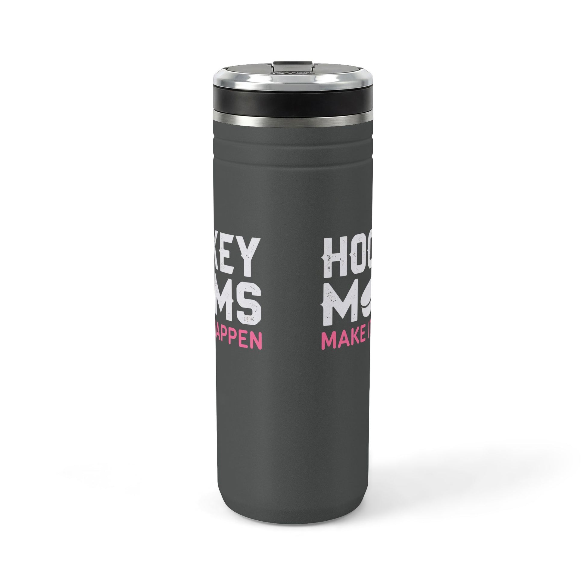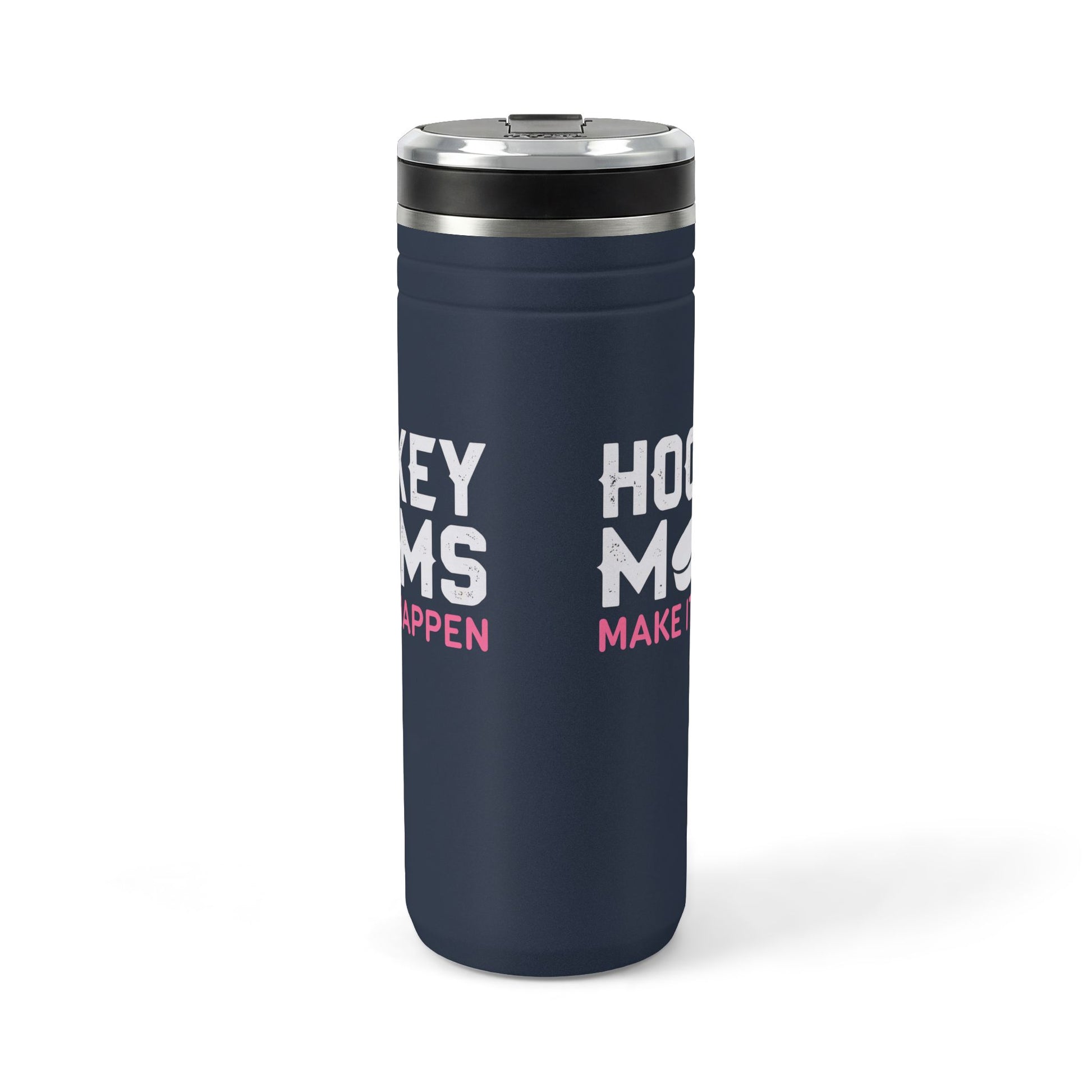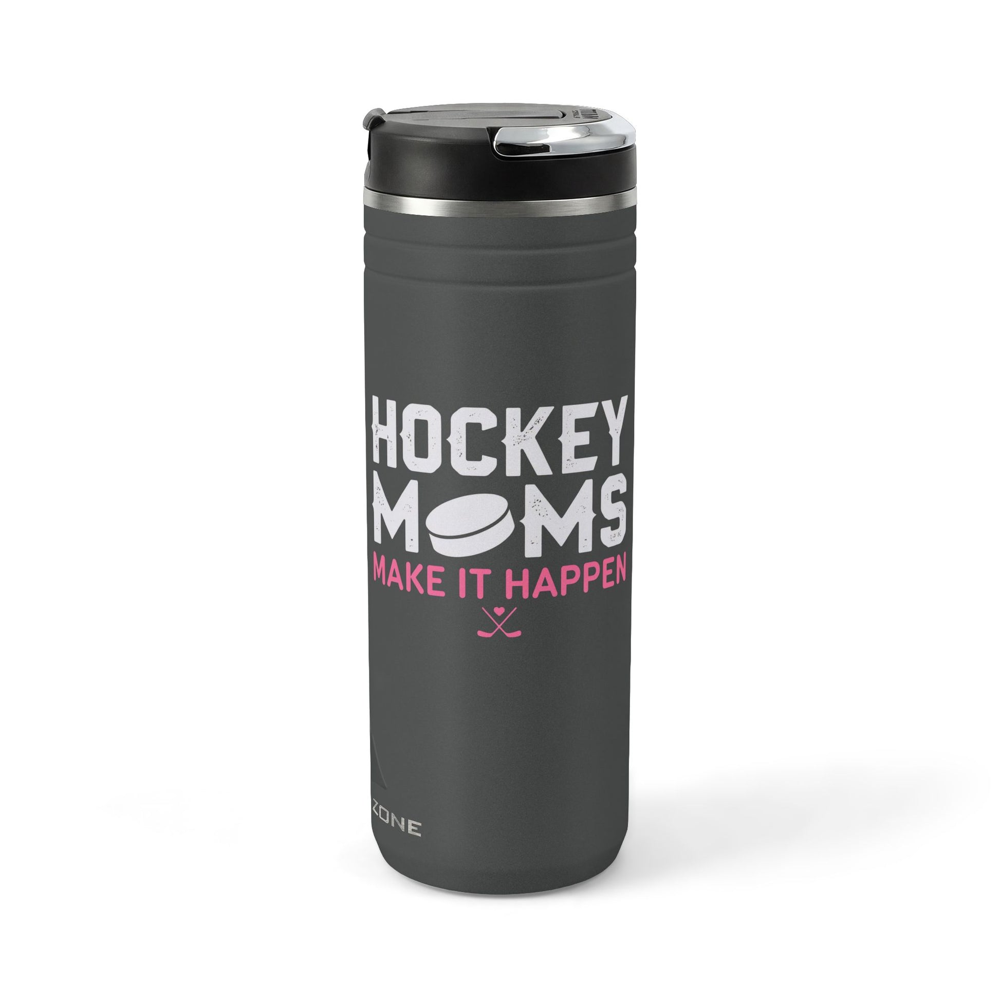This insulated 24oz thermal straw tumbler keeps caffeine hot through early morning practices and ice-cold water through long games. The matte charcoal finish features bold, playful lettering and a puck graphic that reads “HOCKEY MOMS — MAKE IT HAPPEN,” a design that celebrates the hustle of rink runs, gear bags, and cheering from the stands. The screw-on lid with flip-up straw makes quick sips between drills easy, while the no-condensation powder coating stays clean and scuff-resistant after season-long use. Sized to fit most cup holders and built from 18/8 stainless steel, it’s made for parents who move fast and need a reliable bottle that looks like it belongs in the team zone.