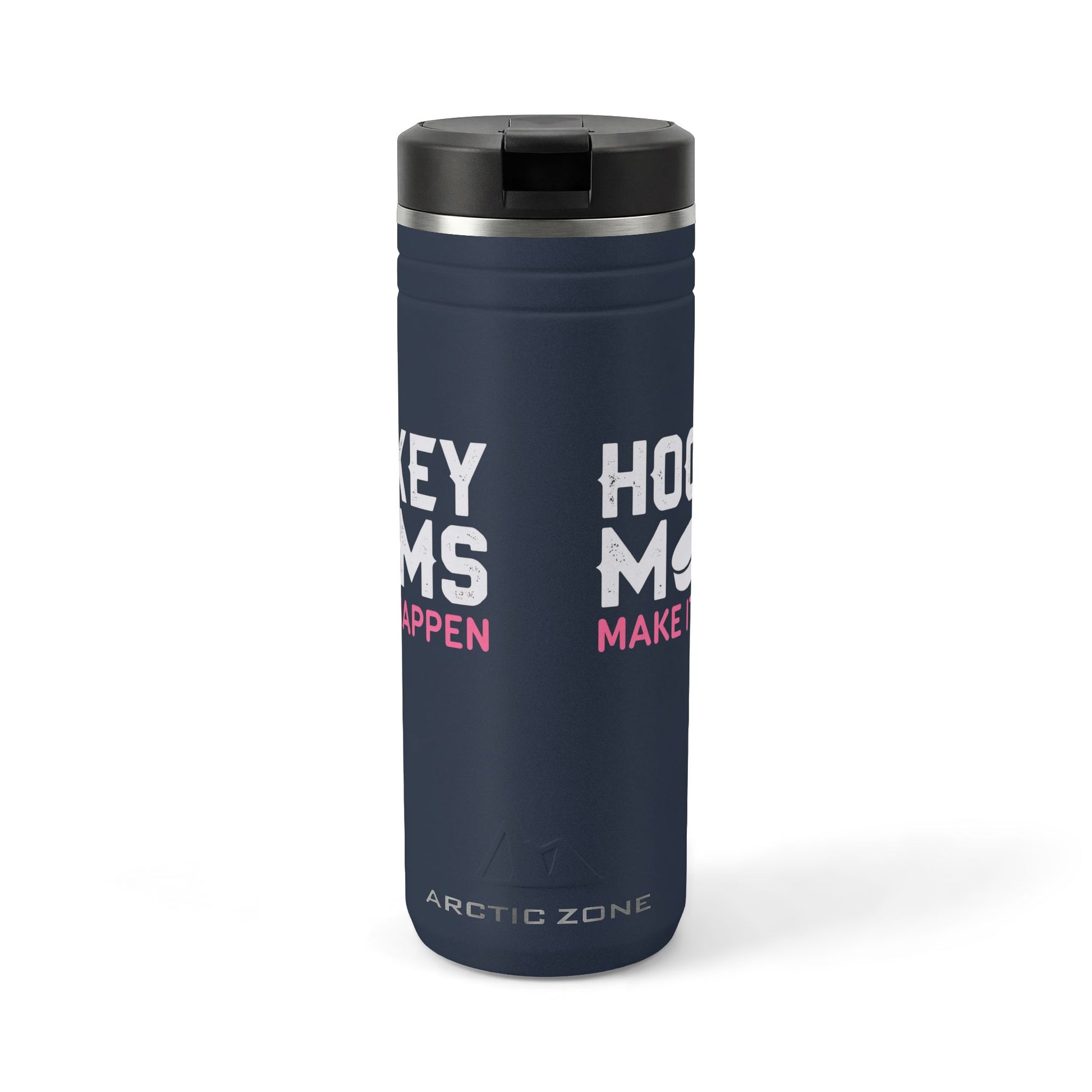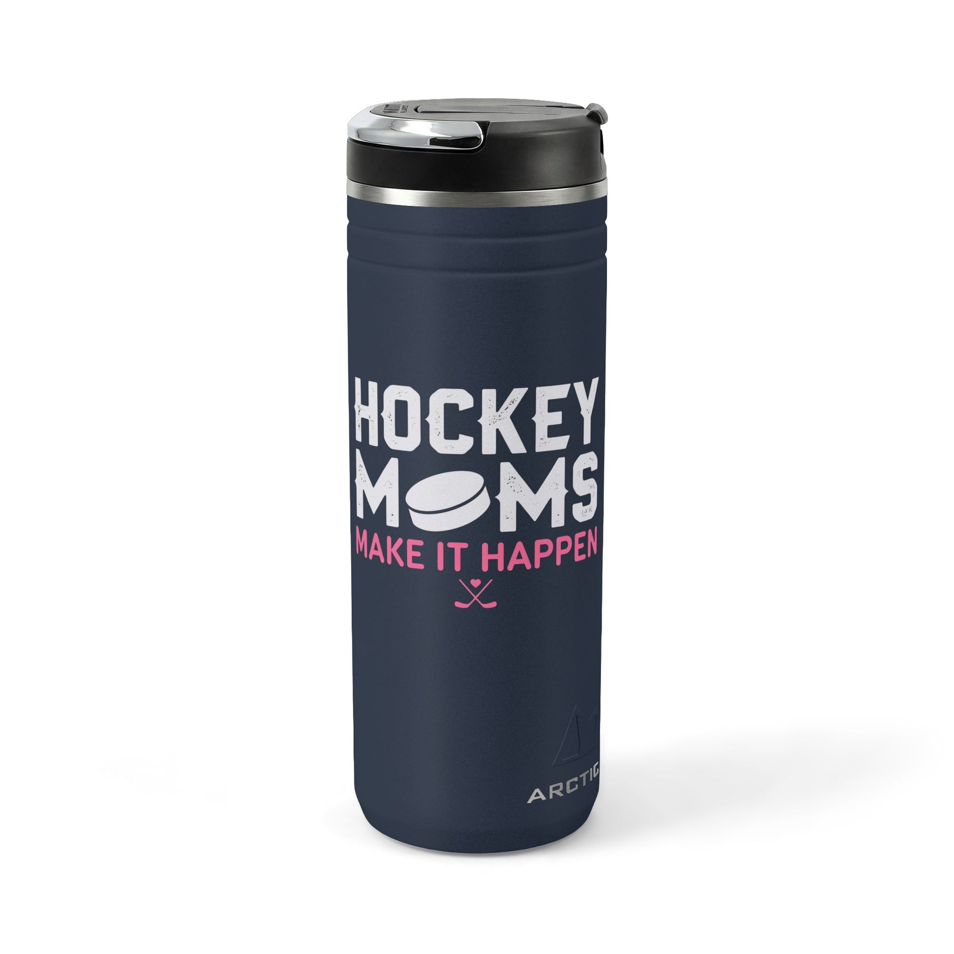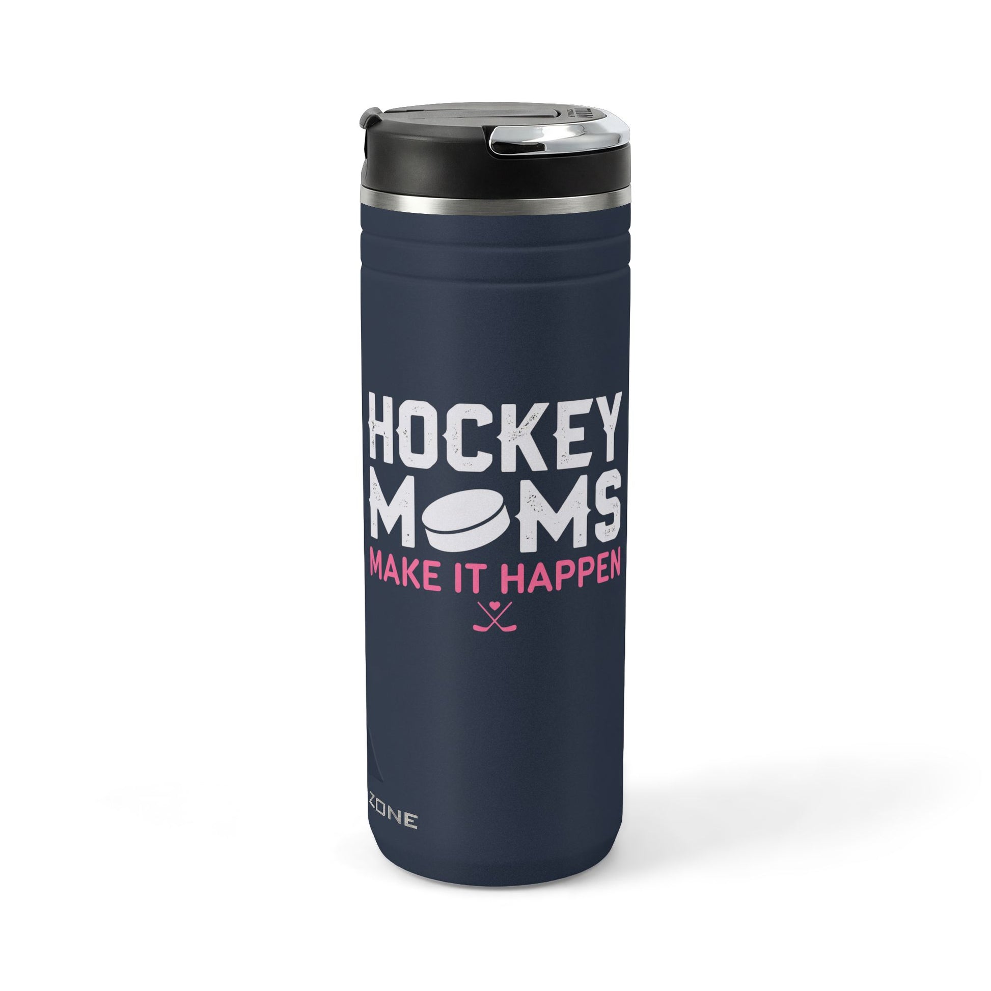 This insulated 24oz thermal straw tumbler keeps caffeine hot through early morning practices and ice-cold water through long games. The matte charcoal finish features bold, playful lettering and a puck graphic that reads “HOCKEY MOMS — MAKE IT HAPPEN,” a design that celebrates the hustle of rink runs, gear bags, and cheering from the stands. The screw-on lid with flip-up straw makes quick sips between drills easy, while the no-condensation powder coating stays clean and scuff-resistant after season-long use. Sized to fit most cup holders and built from 18/8 stainless steel, it’s made for parents who move fast and need a reliable bottle that looks like it belongs in the team zone.